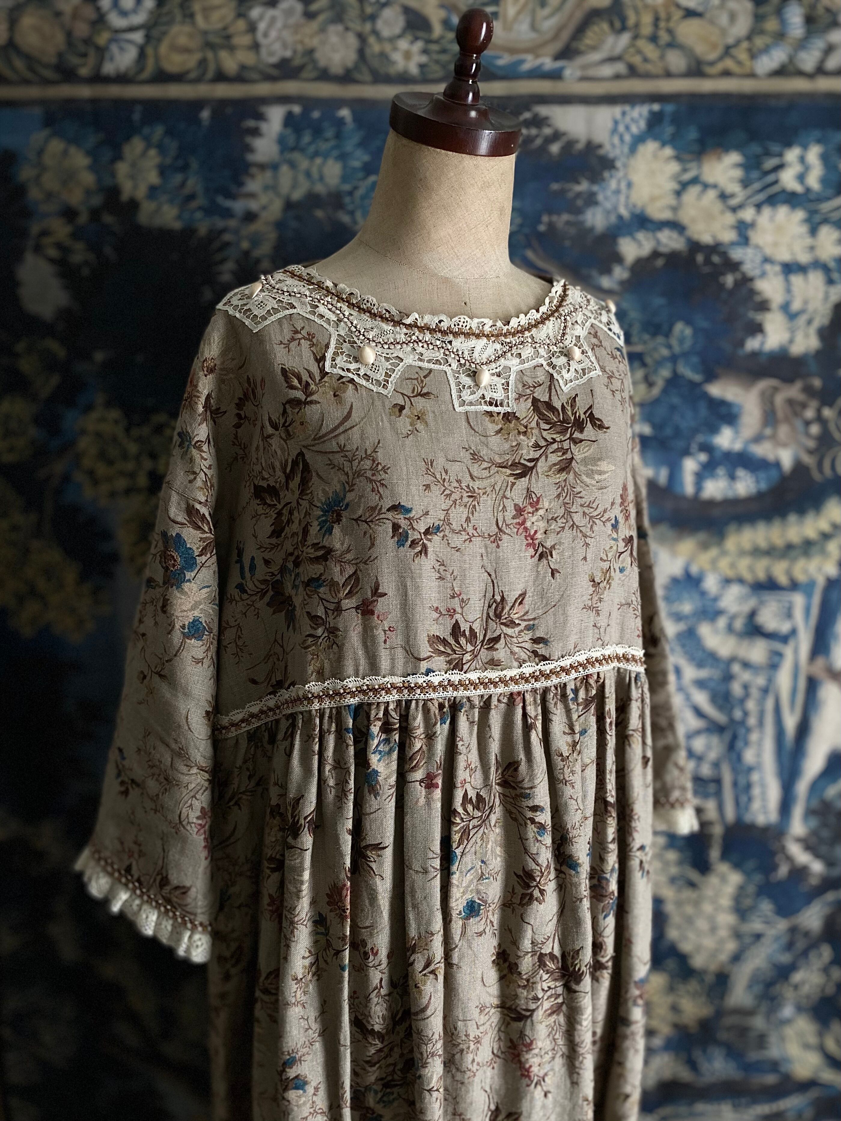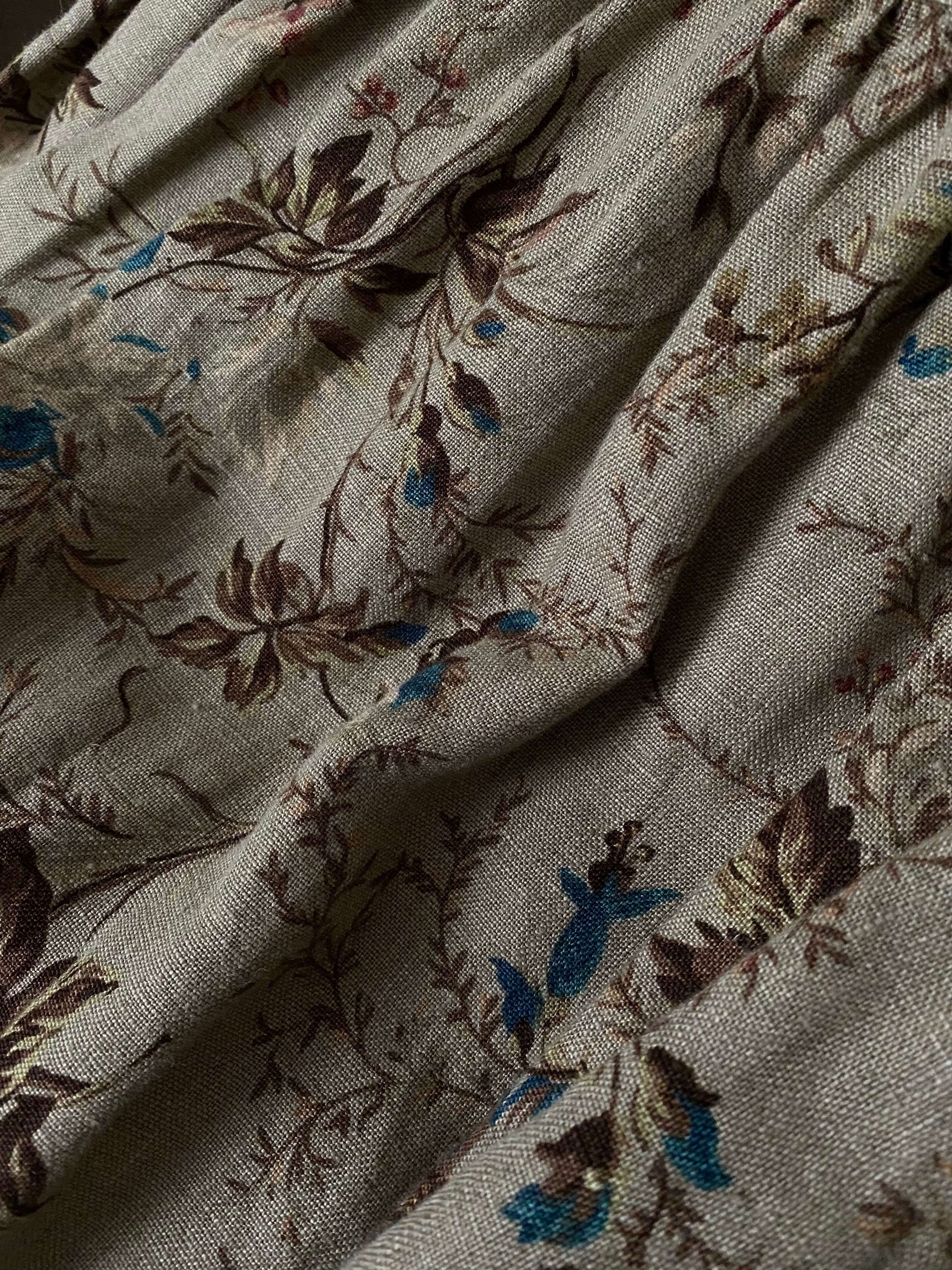 メイン生地にはドライフラワーの様な儚く霞んだ風合いが、アンティークと見紛うばかりの美しい国産リネンをたっぷりと贅沢に。