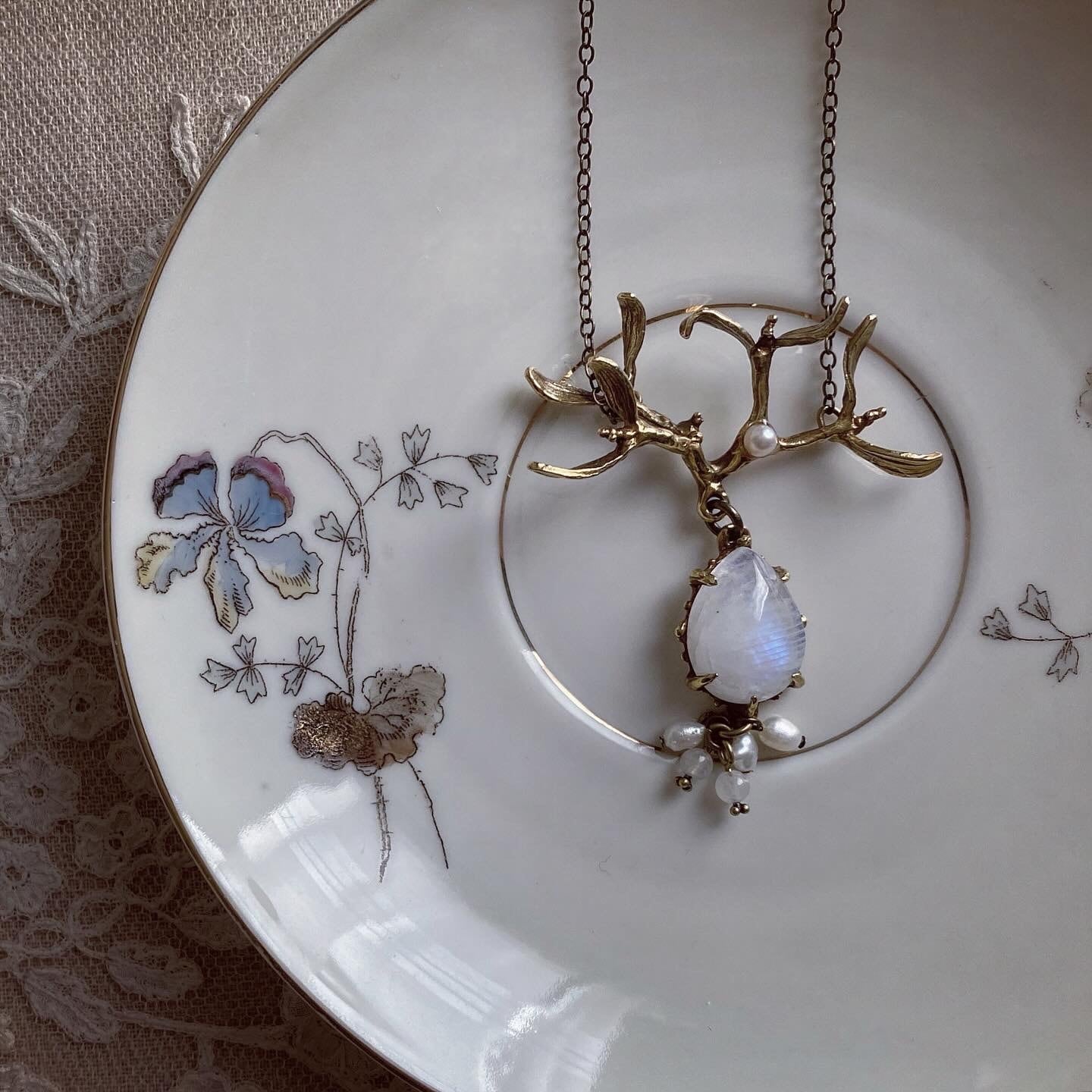 宿り木の実の様に、澄んだ美しさを持つレインボームーンストーンと、小さな淡水パールが可憐に揺れます。