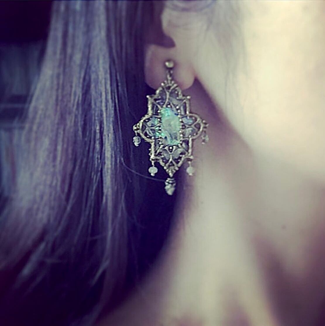 鏡をイメージした真鍮製のTOPの中に、シェルとドライフラワーが封じられたイヤリングです。