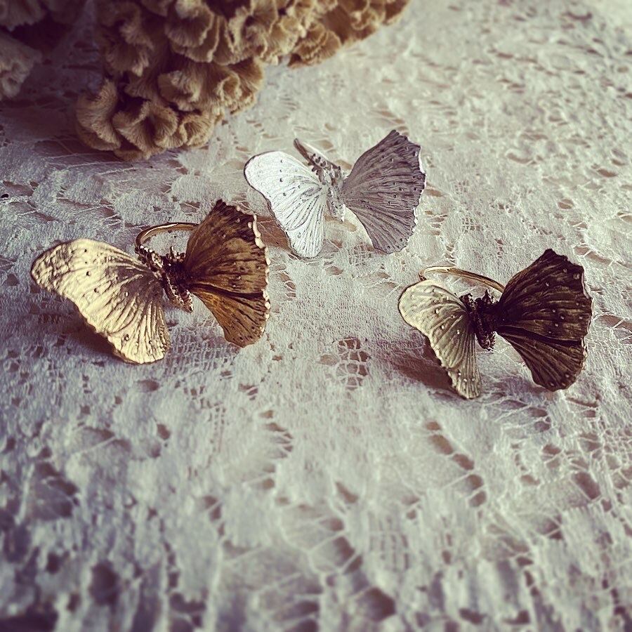 また、蛾のモチーフであるイカリモンガは昼に飛び、翅を閉じてとまる非常に蝶によく似た特徴がみられます。