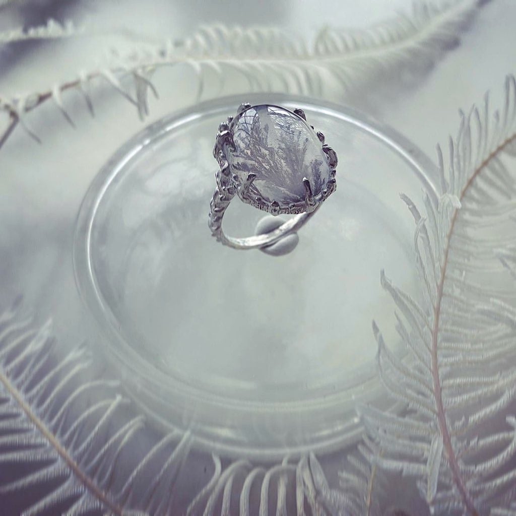 まるで氷漬けになった針葉樹の枝の様なデンドリティッククォーツを使用した一点物のリングです。